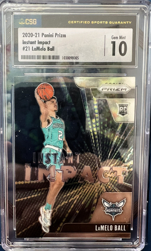 My StoreOriginal price $49.00 - Original price $49.00Original price$49.00$49.00 - $49.00Current price $49.00| /Out of stock2020-21Panini Prizm LaMelo Ball Rookie / Instant Impact 10 Gem Mint